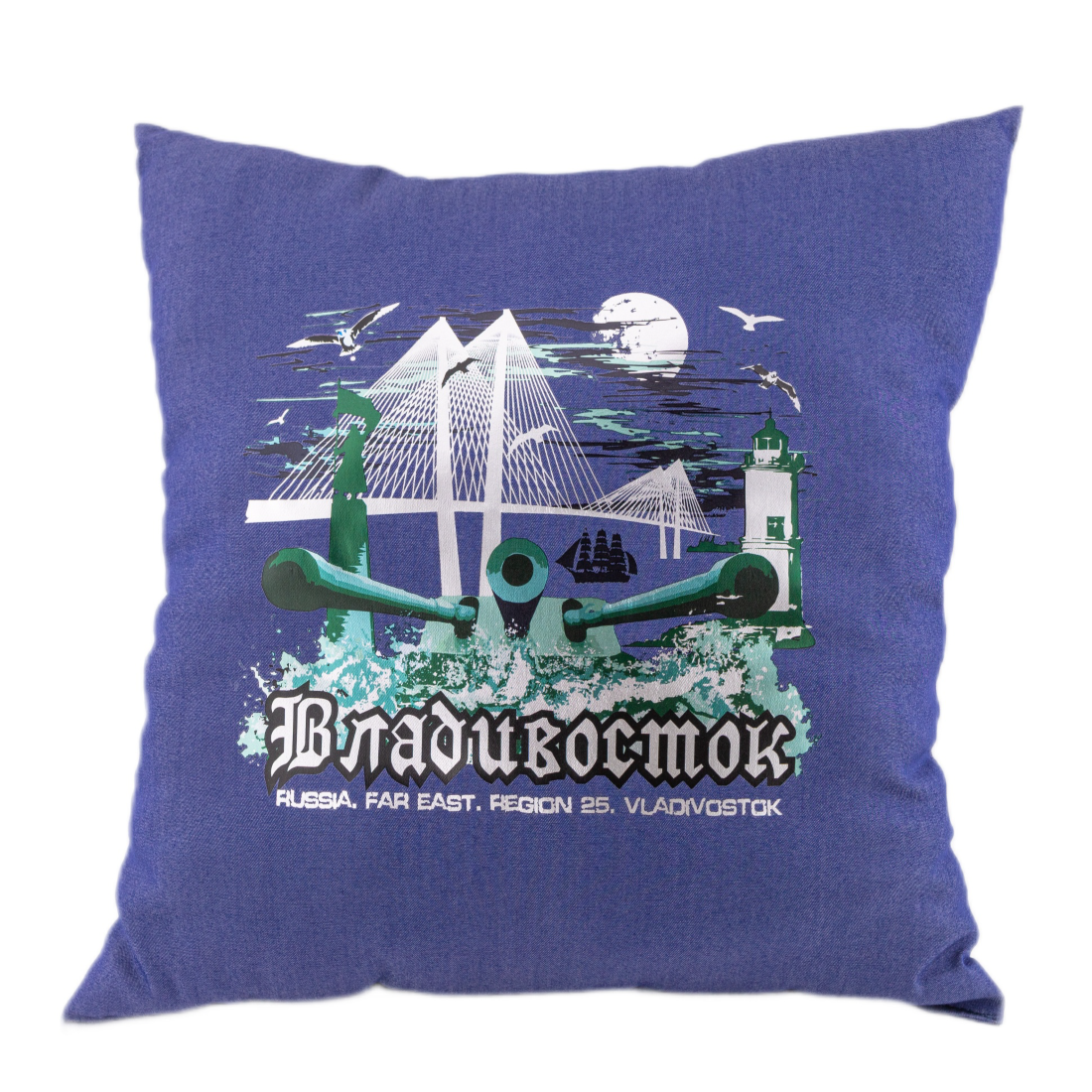 Подушка сувенирная ВЛАДИВОСТОК БАТАРЕЯ. Материал: полиэстер 100%, наполнитель синтепух. Размер 400х400мм. Упаковка ПП пакет.