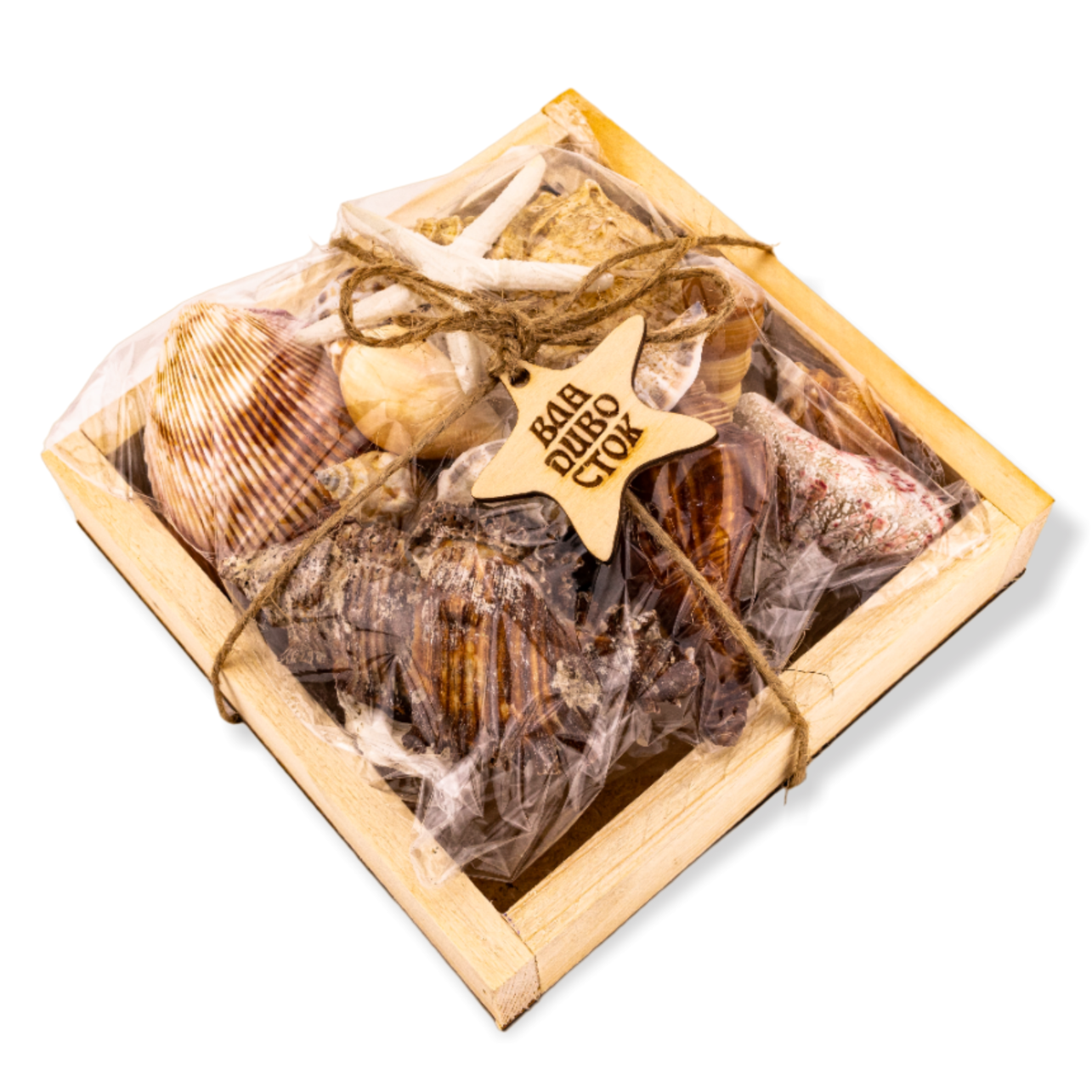 Набор ракушек и гальки в деревянной коробке с деревянным гравированным шильдиком ВЛАДИВОСТОК малый. Состав: ракушки морские, галька, массив сосны, фанера. Размер 15х15х5см. ПП пакет.