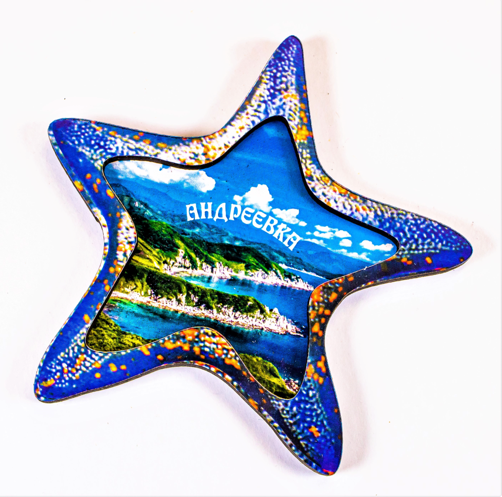Магнит деревянный 2-слойный ЗВЕЗДА Андреевка Побережье. Материал: ДВП, бумага. Размер 80х80мм. Упаковка: ПП пакет.