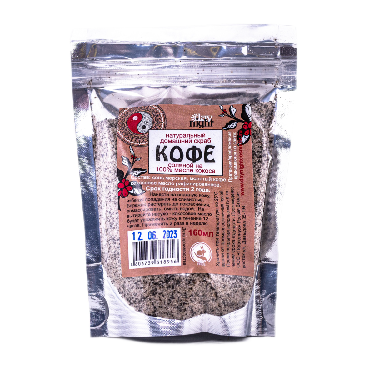 Натуральный домашний скраб "Кофе" 160 мл. Состав: соль морская, молотый кофе, кокосовое масло РДО. Упаковка: дой-пак пакет.