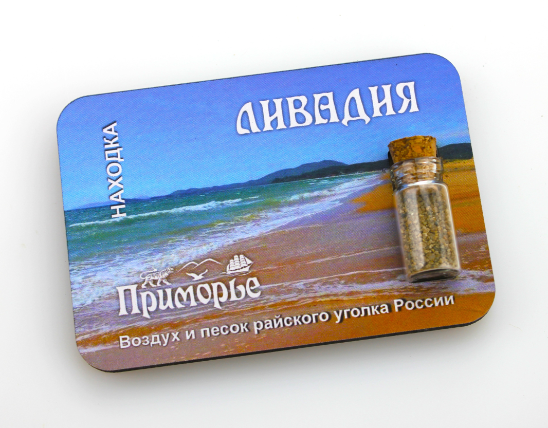 Магнит деревянный 2-слойный с бутылочкой песка Ливадия Пляж. Материал: ДВП, бумага, бутылочка. Размер 100х70мм. ПП пакет.