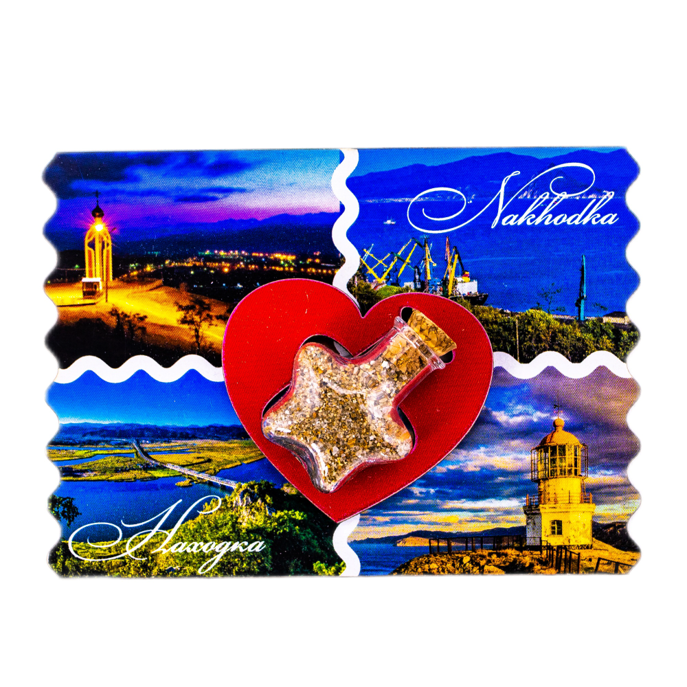 Магнит деревянный 2-слойный с бутылочкой песка Находка Коллаж Сердцек-2