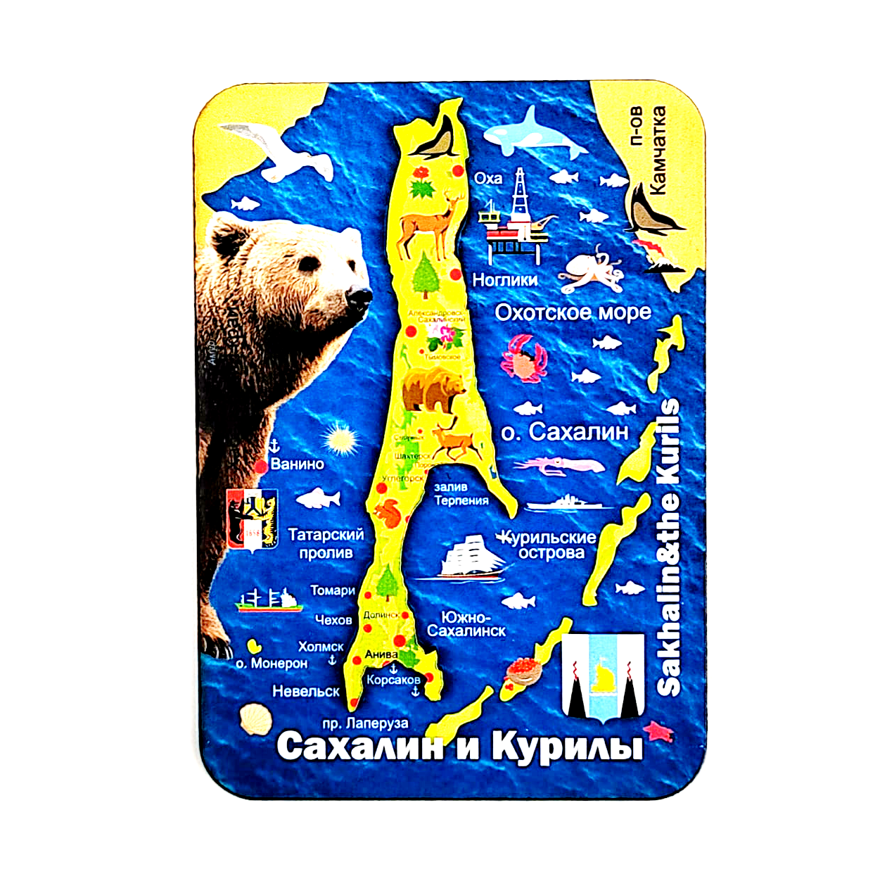 Магнит деревянный 2-слойный САХАЛИН КАРТА. Материал: ДВП, бумага, песок. Размер 75х100х15 мм. Упаковка: ПП пакет