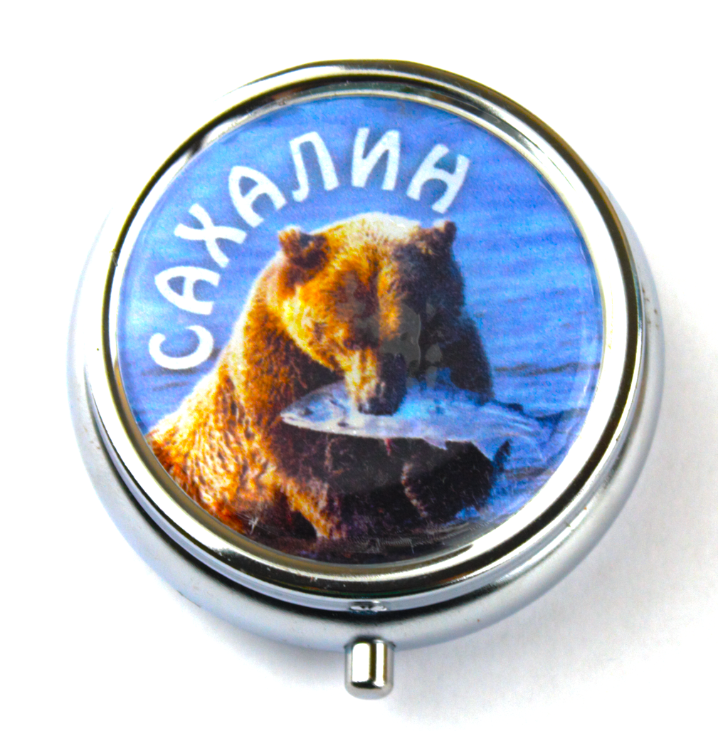Таблетница с полноцветным изображением на крышке САХАЛИН МЕДВЕДЬ. Материал: металл, пластик, ПВХ, Эпоксидная смола. Размер 50х50х1,7 мм. Упаковка: ПП пакет.