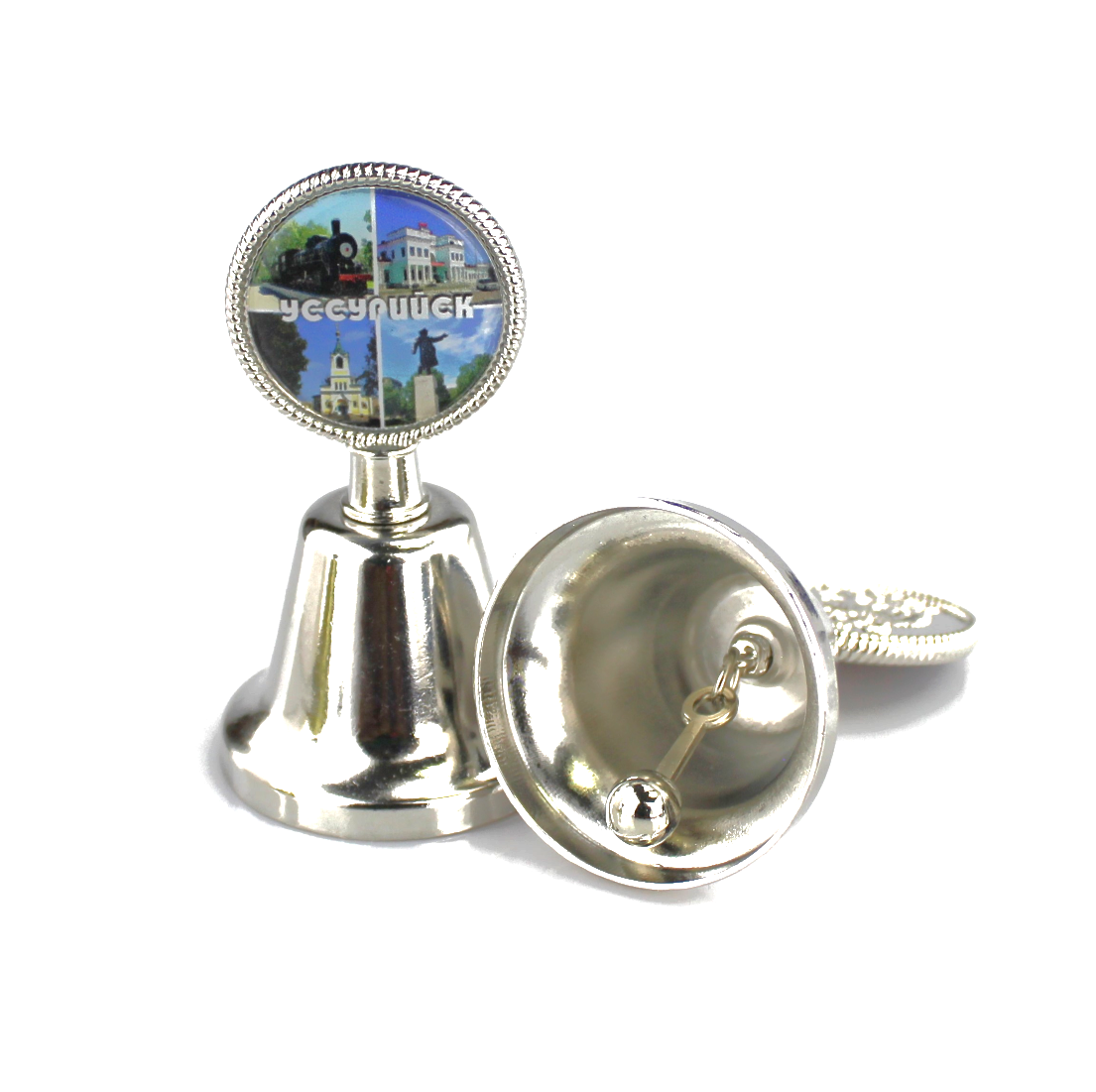 Колокольчик сувенирный с эпоксидной смолой Уссурийск Коллаж. Размер: 4.5х4.5х8 см. Материал: металл, эпоксидная смола. Упаковка: белая картонная коробка.