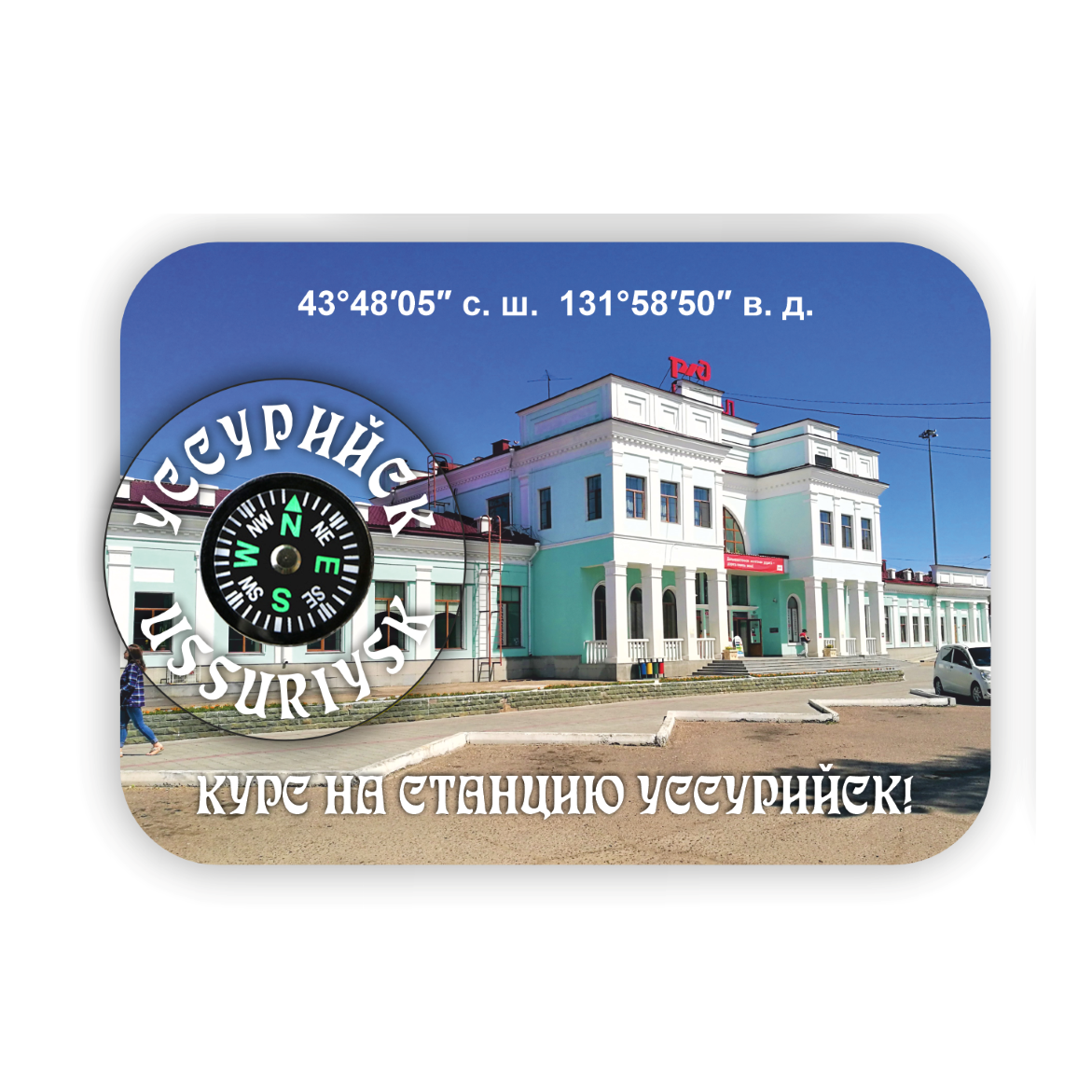 Магнит деревянный 2-слойный с компасом Уссурийск СТАНЦИЯ. Материал: ДВП, бумага, пластик. Размер 9.5х7х 0.8 см. ПП пакет.
