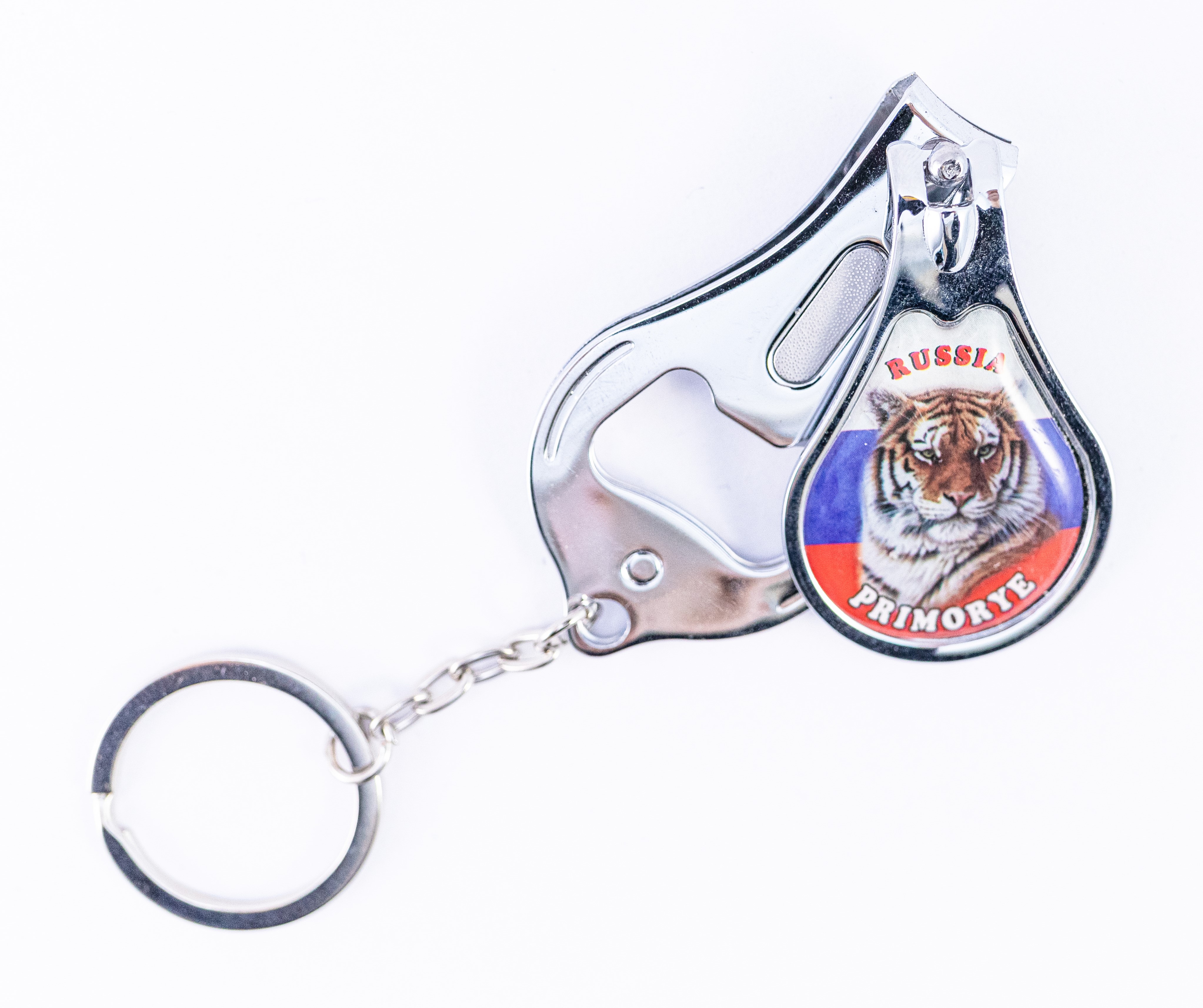 Брелок-кусачки Приморье Тигр с полноцветным изображением. Материал: металл, эпокситная смола. Размер: 12х3,5х1,5 см. картонный подвес.