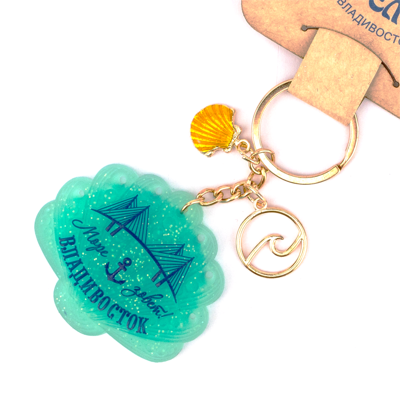 Брелок с ПВХ подвеской ВЛАДИВОСТОК МОРЕ ЗОВЕТ и металлическими "золотыми" подвесками ВОЛНА и ГРЕБЕШОК бирюзовый. Материал: фурнитура металлическая "золотая", мягкий ПВХ. Размер: 8,5хсм. Упаковка: ПП пакет.