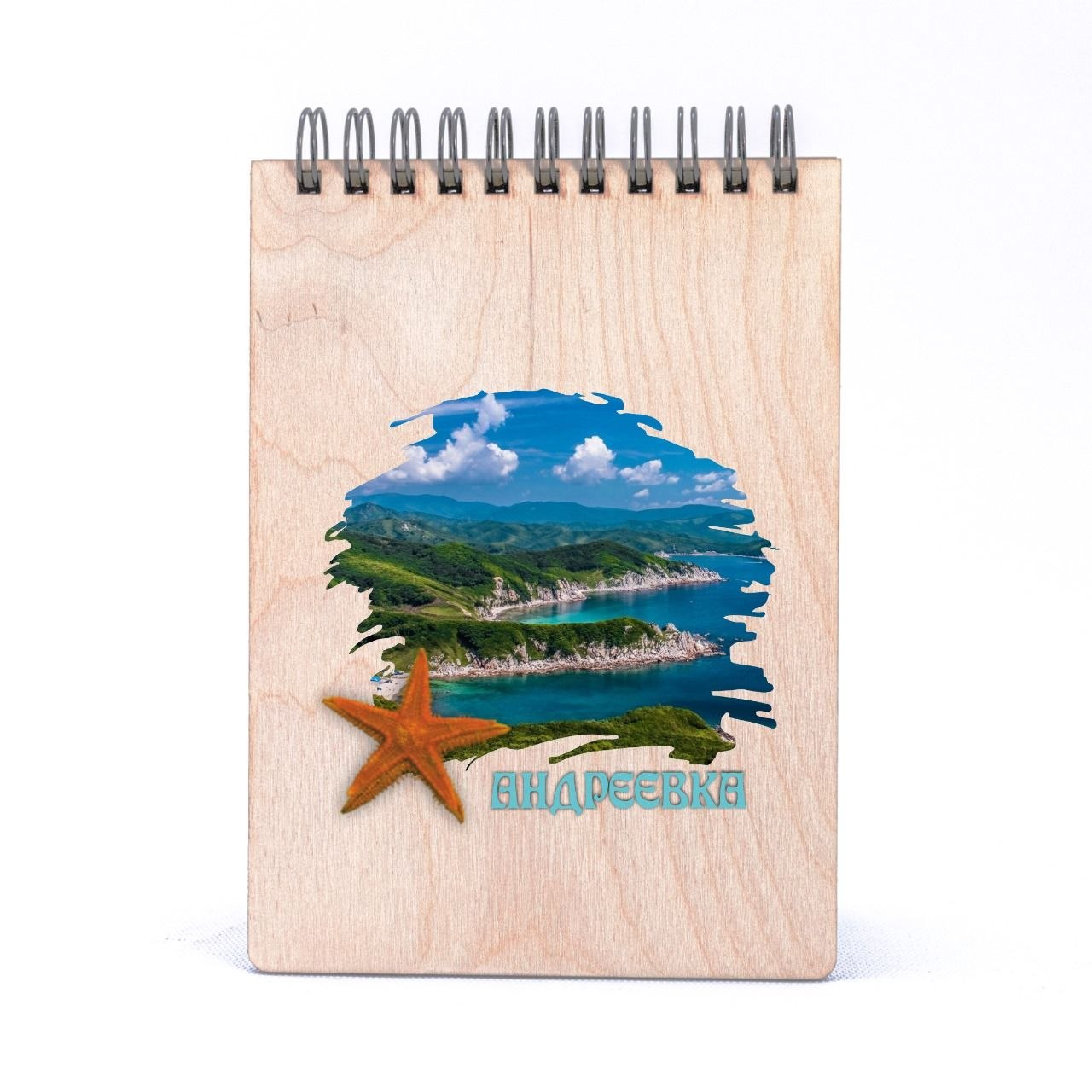 Блокнот А7 60 листов белой бумаги в деревянной обложке с печатью Андреевка Звезда. Размер: 7х11 см. Материал: фанера 3мм, бумага. Упаковка: ПП пакет.