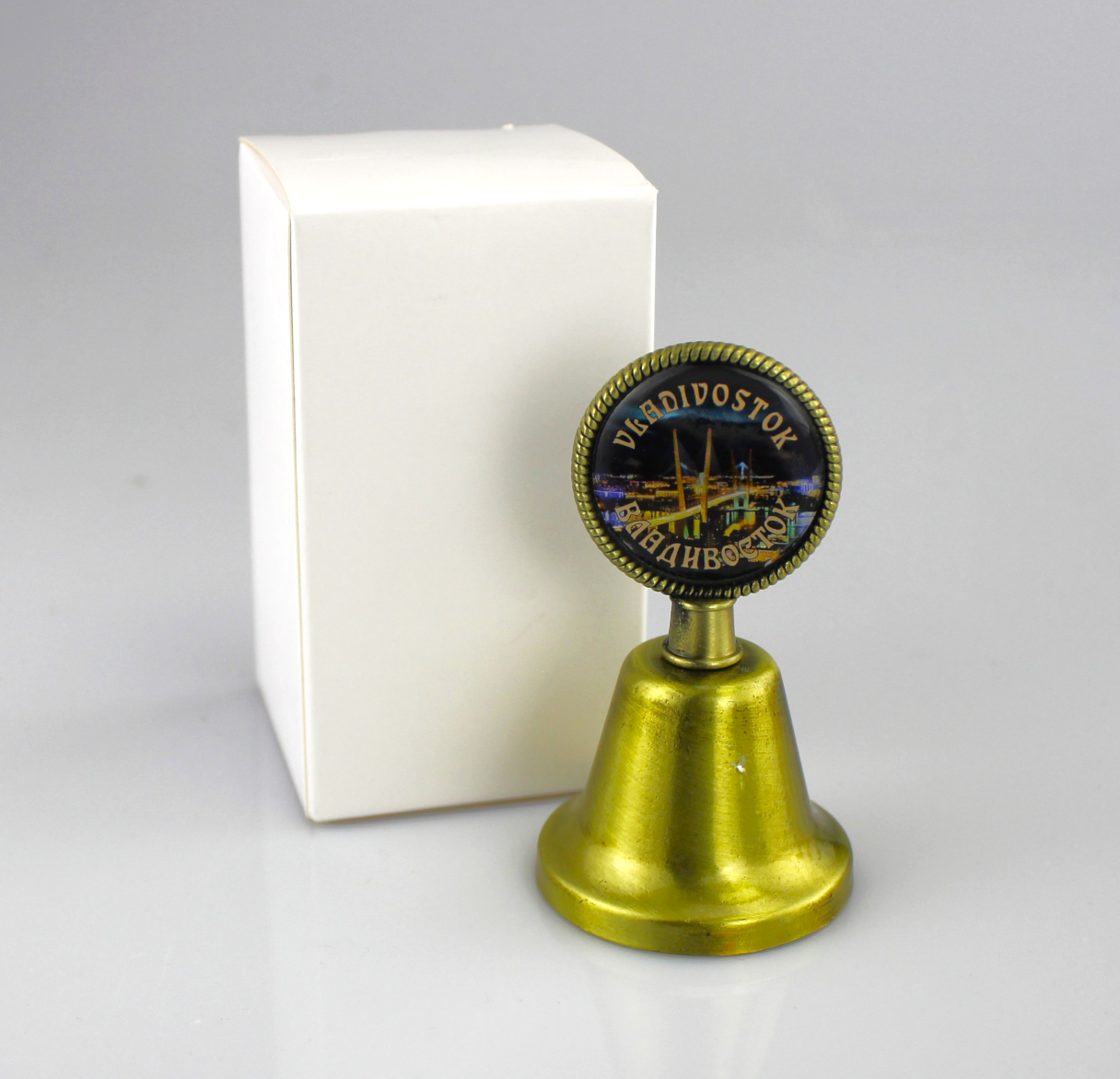 Колокольчик сувенирный с эпоксидной смолой Владивосток Коллаж. Размер: 4.5х4.5х8 см. Материал: металл, эпоксидная смола. Упаковка: белая картонная коробка.