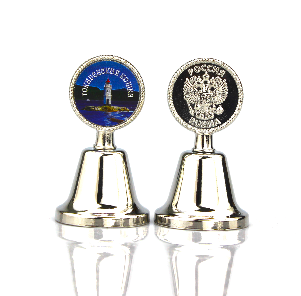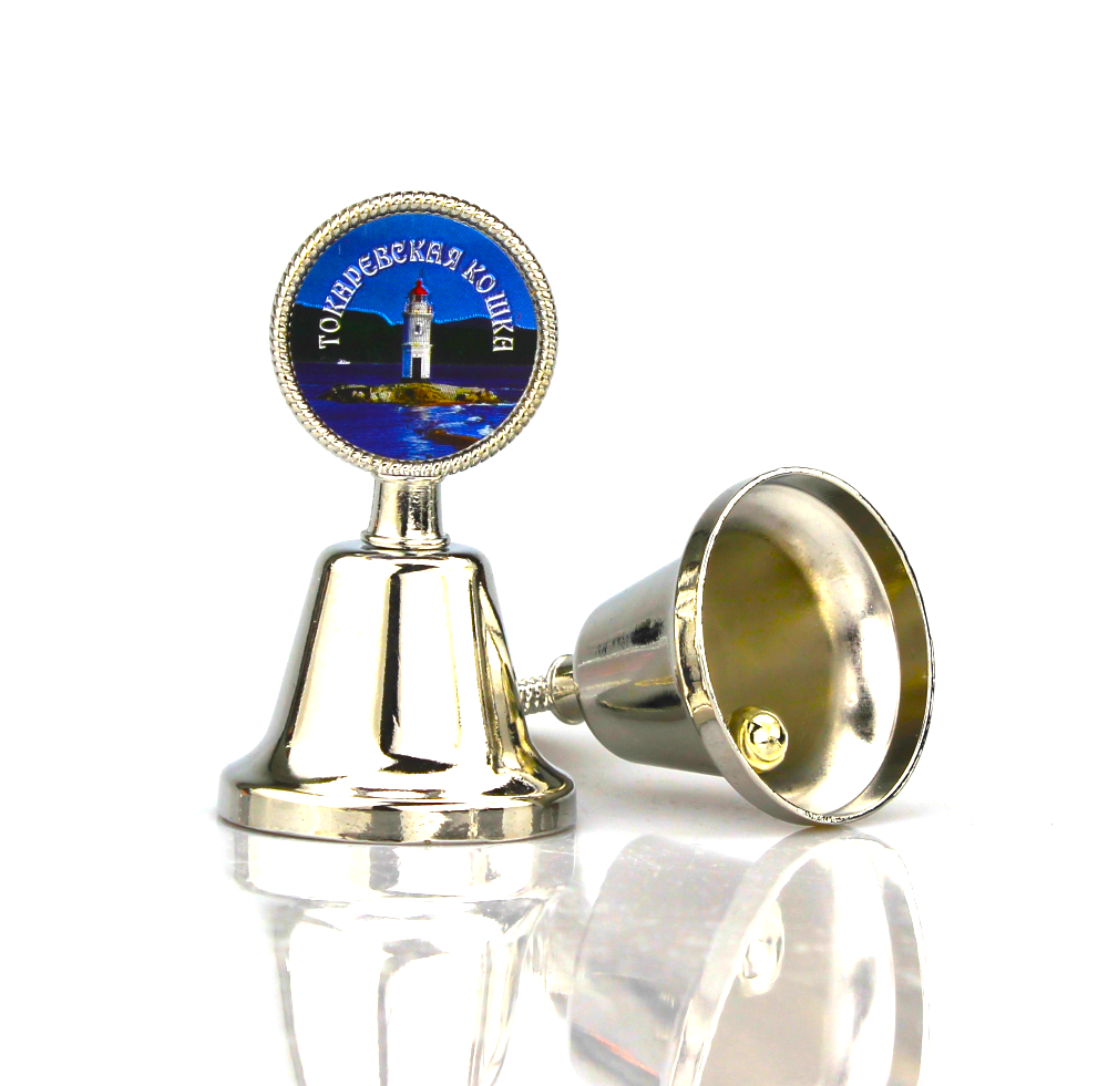 Колокольчик сувенирный с вставкой из тисненной фольги Токаревская кошка. Размер: 4.5х4.5х8 см. Материал: металл. Упаковка: белая картонная коробка.