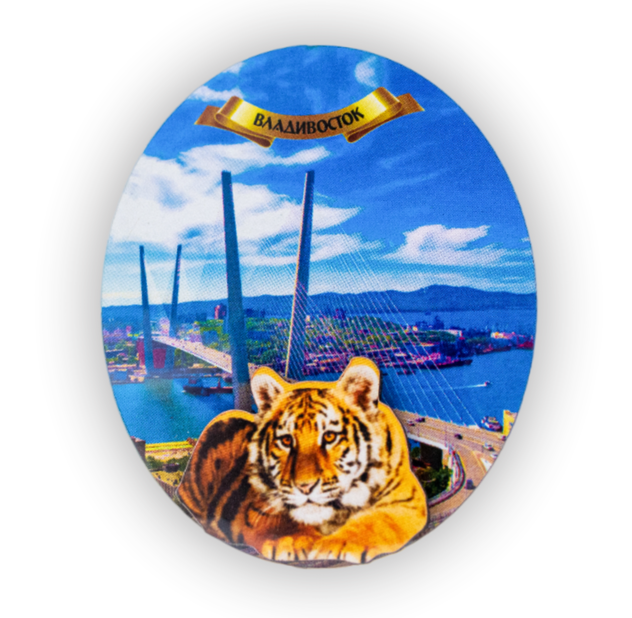 Магнит деревянный 2-слойный ВЛАДИВОСТОК ОВАЛ ТИГР: МОСТ ДЕНЬ. ДВП, бумага. Размер 55*80мм. ПП пакет