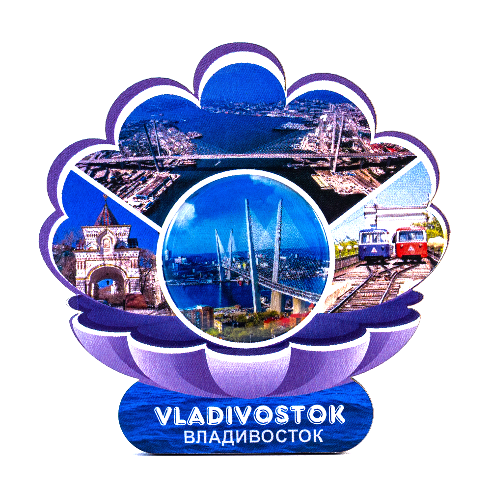 Магнит деревянный 1-слойный с линзой ГРЕБЕШОК ВЛАДИВОСТОК: МОСТЫ, АРКА, ФУНИКУЛЕР. Материал: ДВП, бумага. ПП пакет. Размер 85х85мм