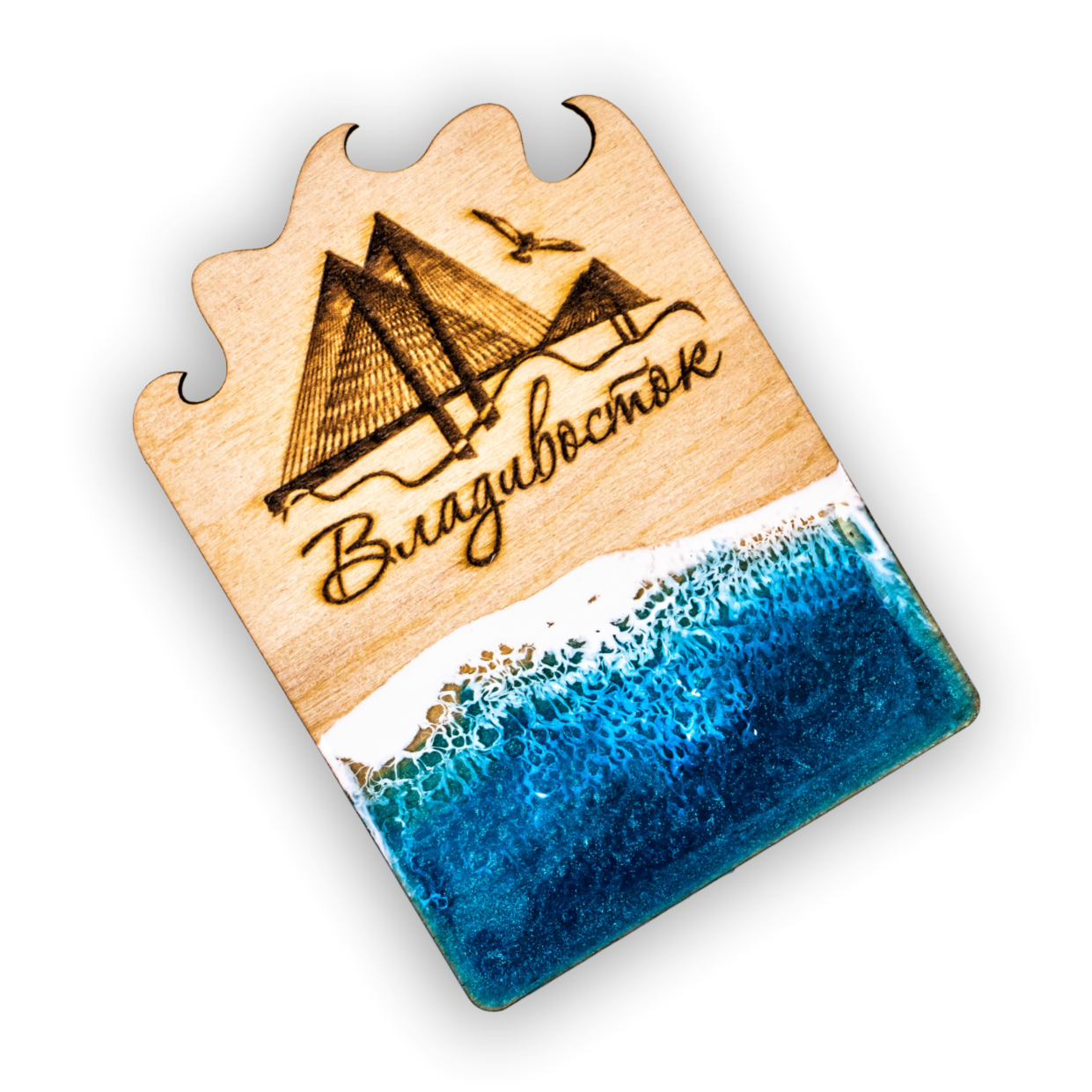 Магнит деревянный с эпоксидной смолой ВОЛНА МОСТ ВЛАДИВОСТОК.