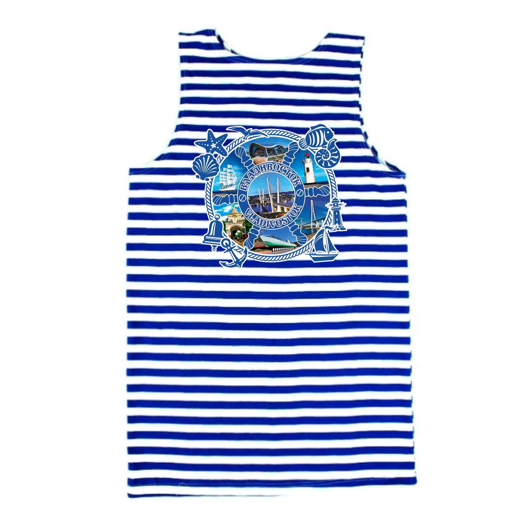 Тельняшка-майка с полноцветной печатью ВЛАДИВОСТОК КОЛЛАЖ. Цвета: бело-синий. Размеры: 46-58. Материал: 100% хлопок. Упаковка ПП пакет.