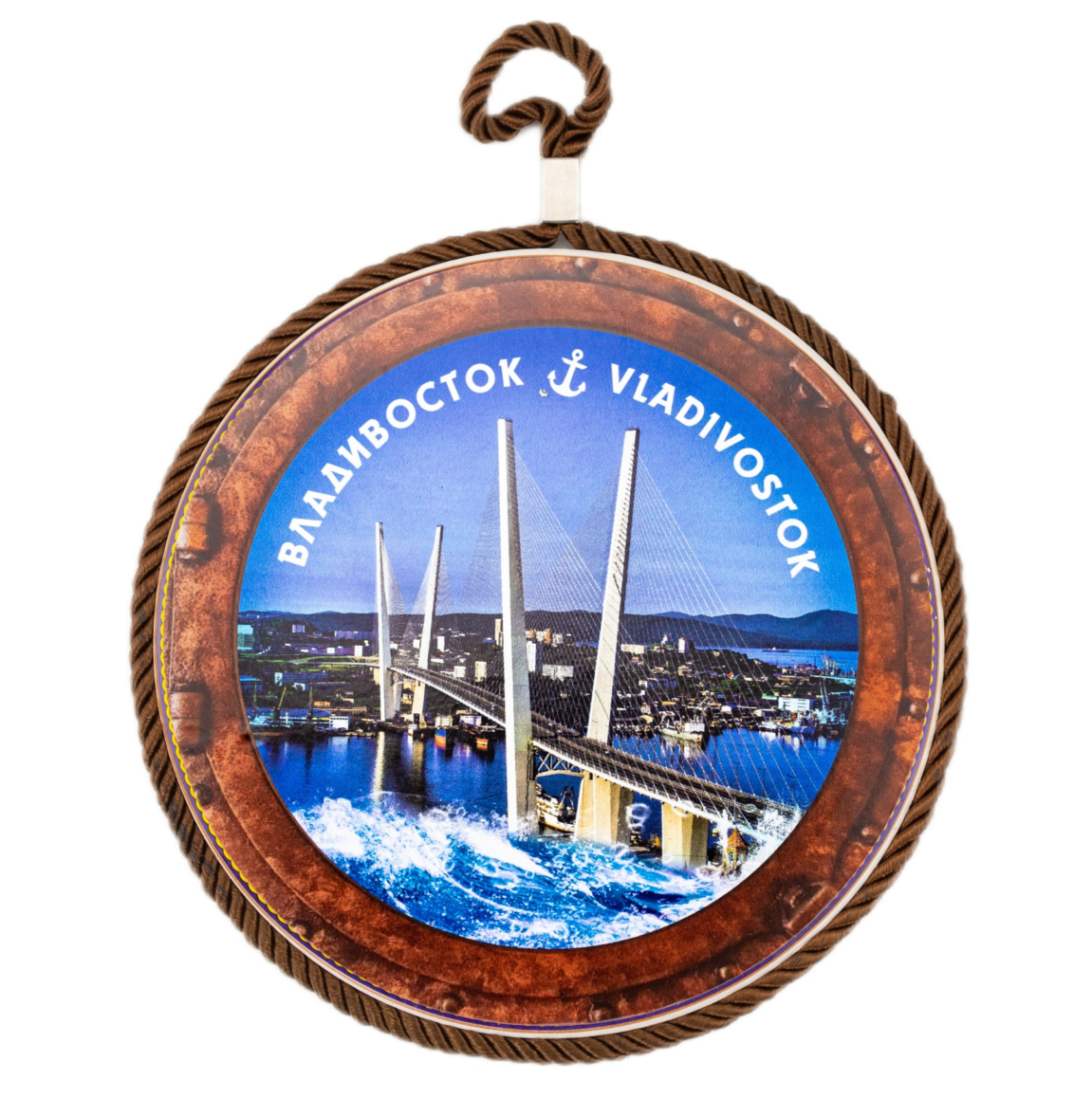 Панно с подвесом Владивосток Мост День. Размер:18х18х1 см. Материал: керамика, капроновый канат, ПВХ. Упаковка: картонная коробка с окном.