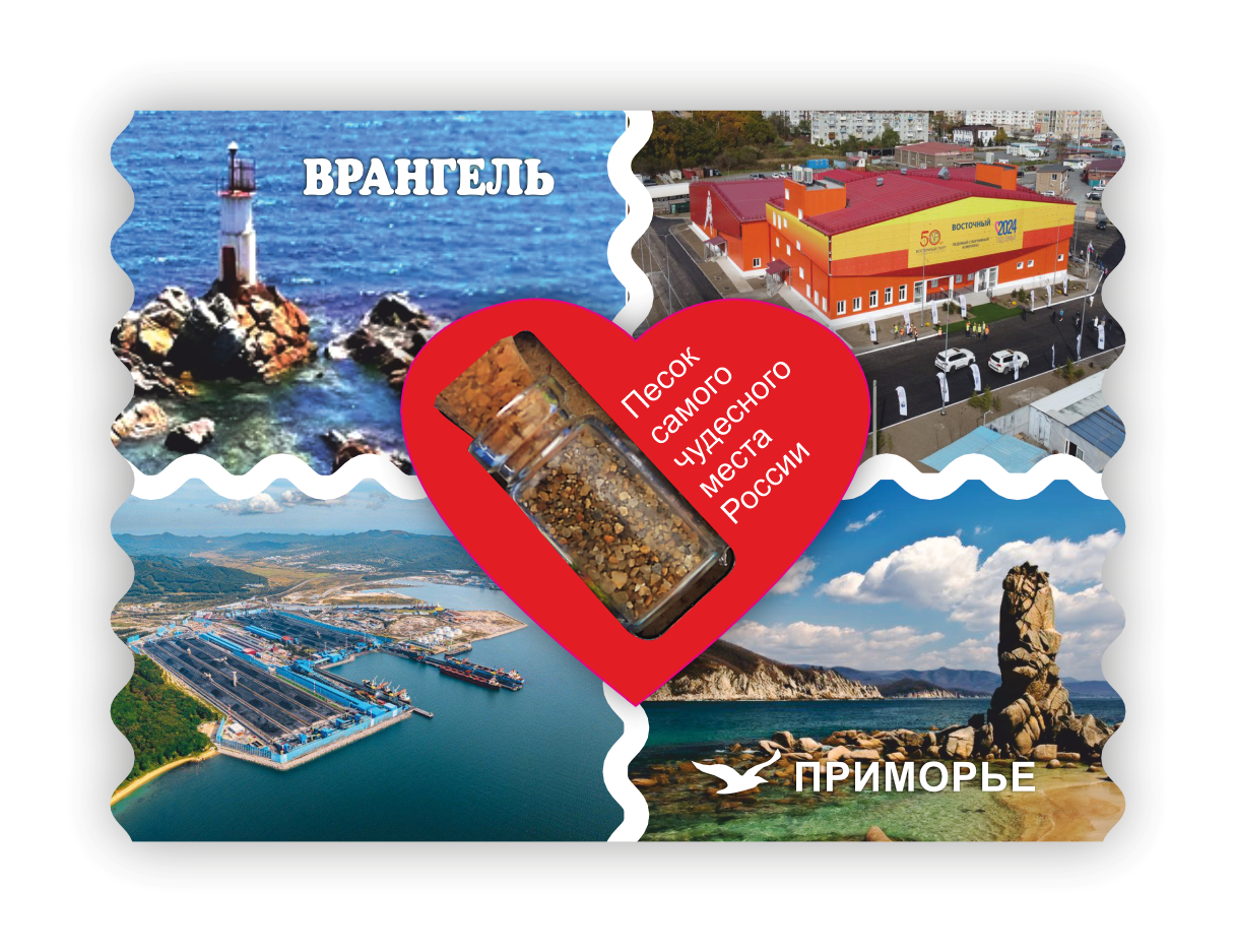 Магнит деревянный 2-слойный с бутылочкой песка ВРАНГЕЛЬ КОЛЛАЖ СЕРДЦЕ МАЯК. Материал: ДВП, бумага, стекло, песок. Размер 70х100мм. ПП пакет.