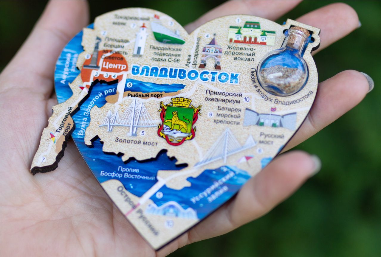 В Приморье обычно мы применяем 2 темы для создания успешного у туристов сувенира: море для всех прибрежных объектов и тайга для всех мест без исключения. На самом деле просто качественно переносим впечатления с туристических троп на носители изображений.