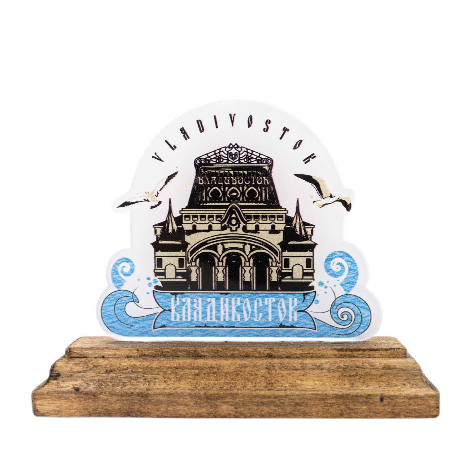 Сувенир настольный акриловый на подставке ВЛАДИВОСТОК ВОКЗАЛ. Размер 13х13х3 см. Материал: акрилоовое стекло 3 мм, массив сосны.. Упаковка: прозрачная ПВХ коробка.