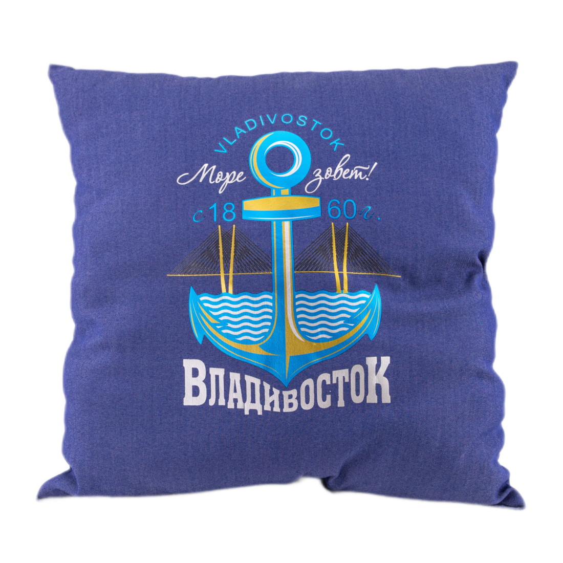 Подушка сувенирная ВЛАДИВОСТОК ЯКОРЬ. Материал: полиэстер 100%, наполнитель синтепух. Размер 400х400мм. Упаковка ПП пакет.