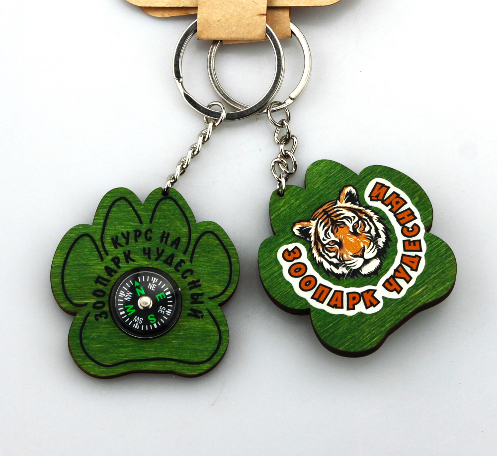 Брелок деревянный с полноцветной печатью, с компасом. Кольцо: бронза. Цвет дерева: синий, зеленый и другие. Материал: фанера, пластик, металл. Размер: 10х5х0,8 см. Упаковка: картонный подвес.