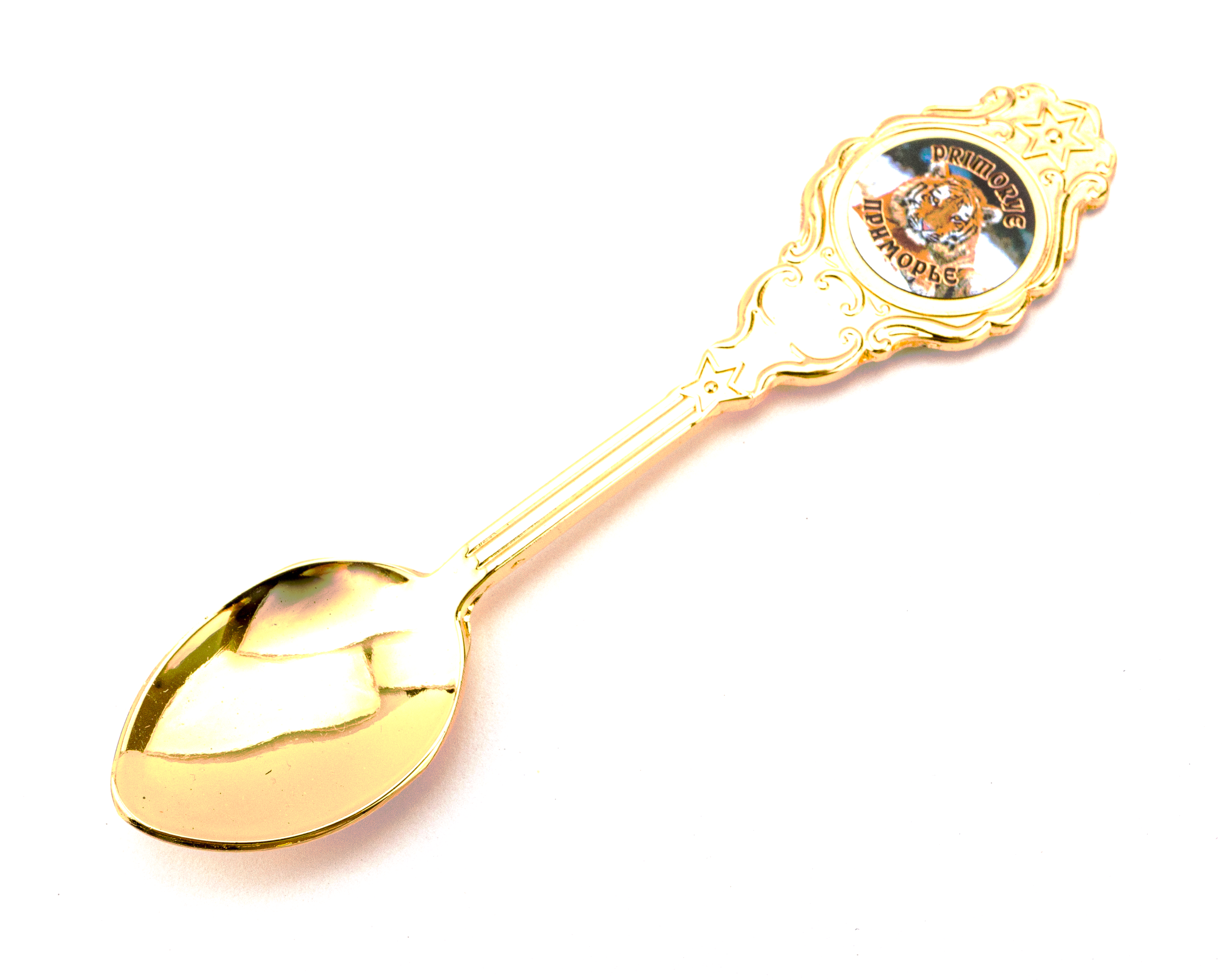 Сувенирная чайная ложка металлическая с гальваническим покрытием золотового цвета с самоклеющейся линзой 18 мм из эпоксидной смолы. Материал: металл, эпоксидная смола. Размер: 10х2х1 см. Упаковка: пакет