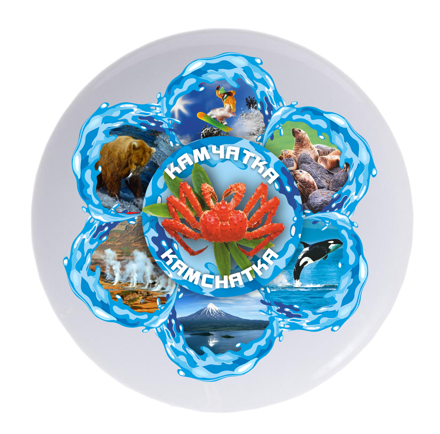 Тарелка керамическая БЕЛАЯ КАМЧАТКА КОЛЛАЖ 20 см с подвесом и пластиковой прозрачной подставкой. Нанесение: ПВХ. Диаметр 20 см. Упаковка: картонная коробка