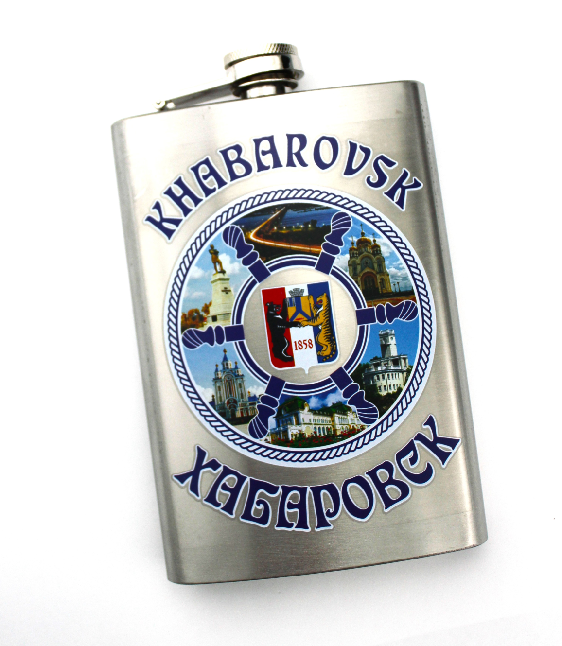 Фляжка "Хабаровск" (250 мл). Размер: 12,5 х 9,5 х 2 см. Нанесение: полноцветная печать.Материал: пищевая нержавеющая сталь AISI 304. Упаковка: пакет.