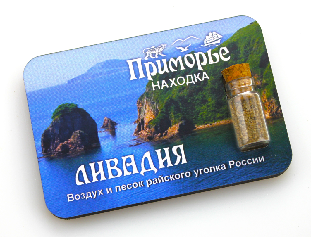 Магнит деревянный 2-слойный с бутылочкой песка Ливадия Кекуры. Материал: ДВП, бумага, бутылочка. Размер 100х70мм. ПП пакет.