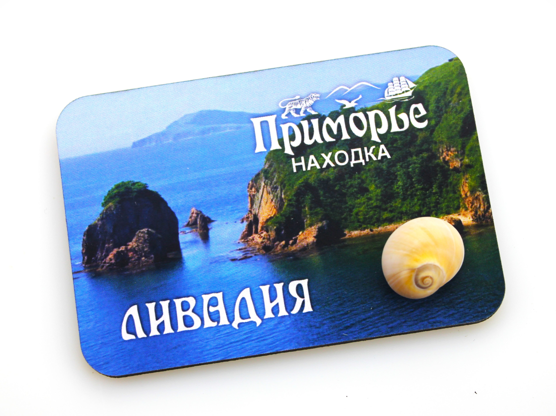 Магнит деревянный с ракушкой Ливадия Кекуры. ДВП, бумага, ракушка. Размер 100х70мм. ПП пакет.