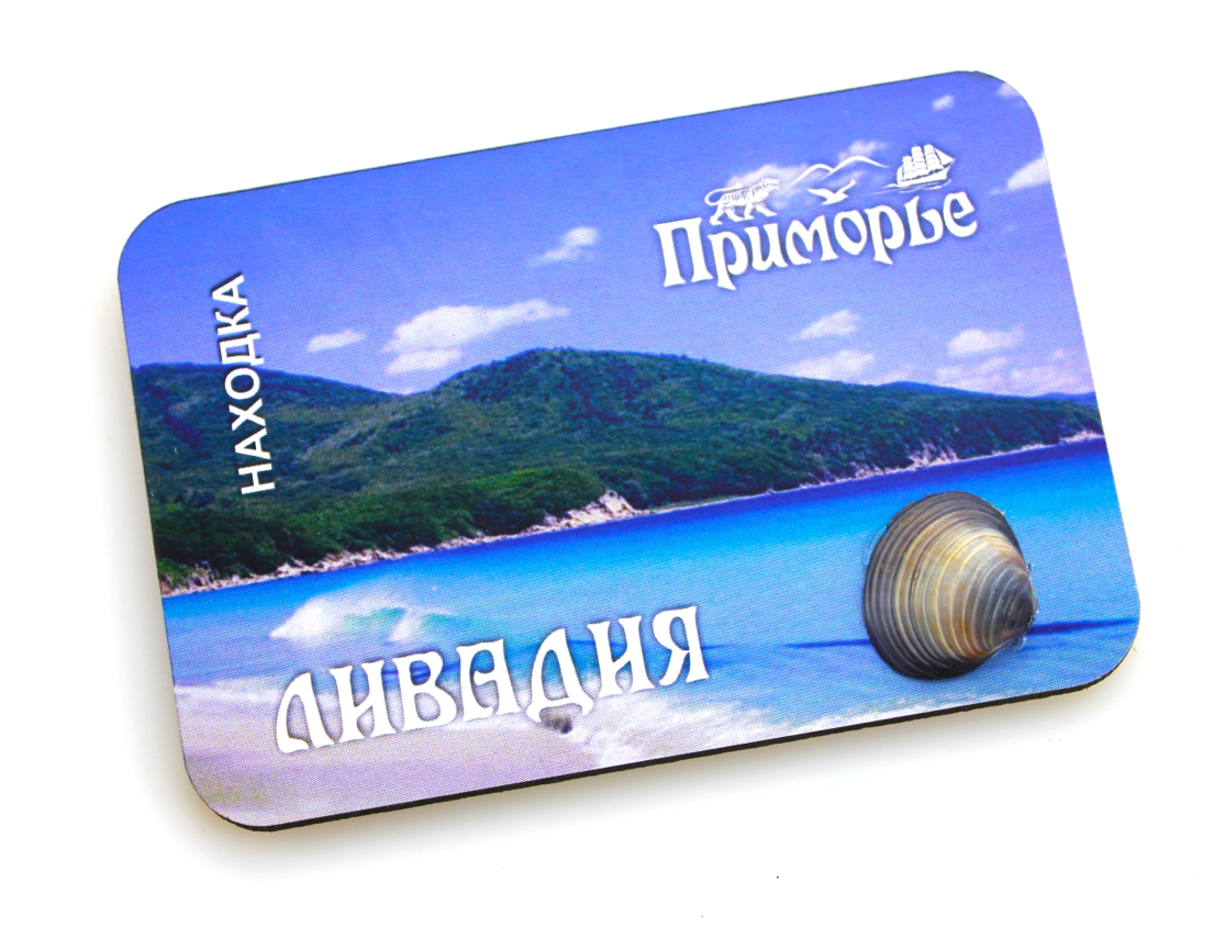 Магнит деревянный с ракушкой Ливадия Прибой. ДВП, бумага, ракушка. Размер 100х70мм. ПП пакет.