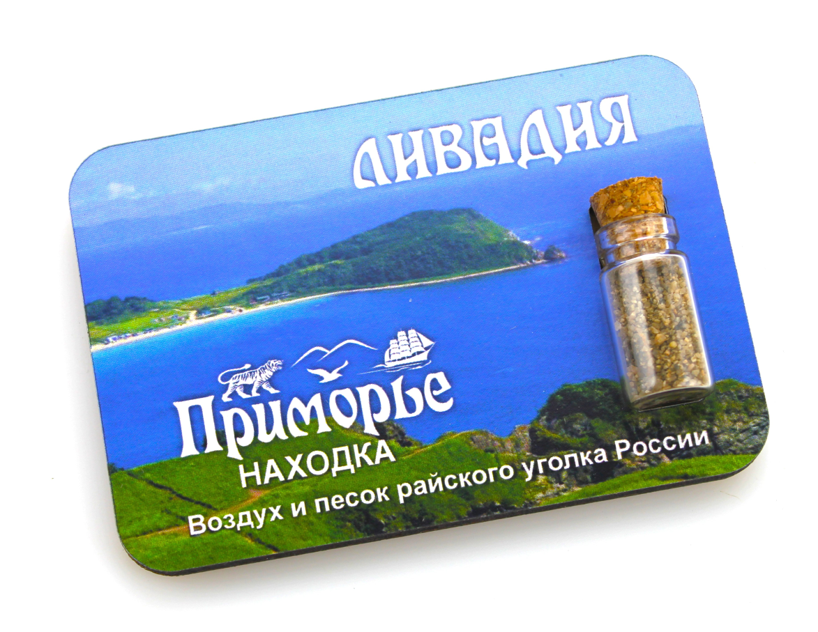 Магнит деревянный 2-слойный с бутылочкой песка Ливадия Бухта. Материал: ДВП, бумага, бутылочка. Размер 100х70мм. ПП пакет.