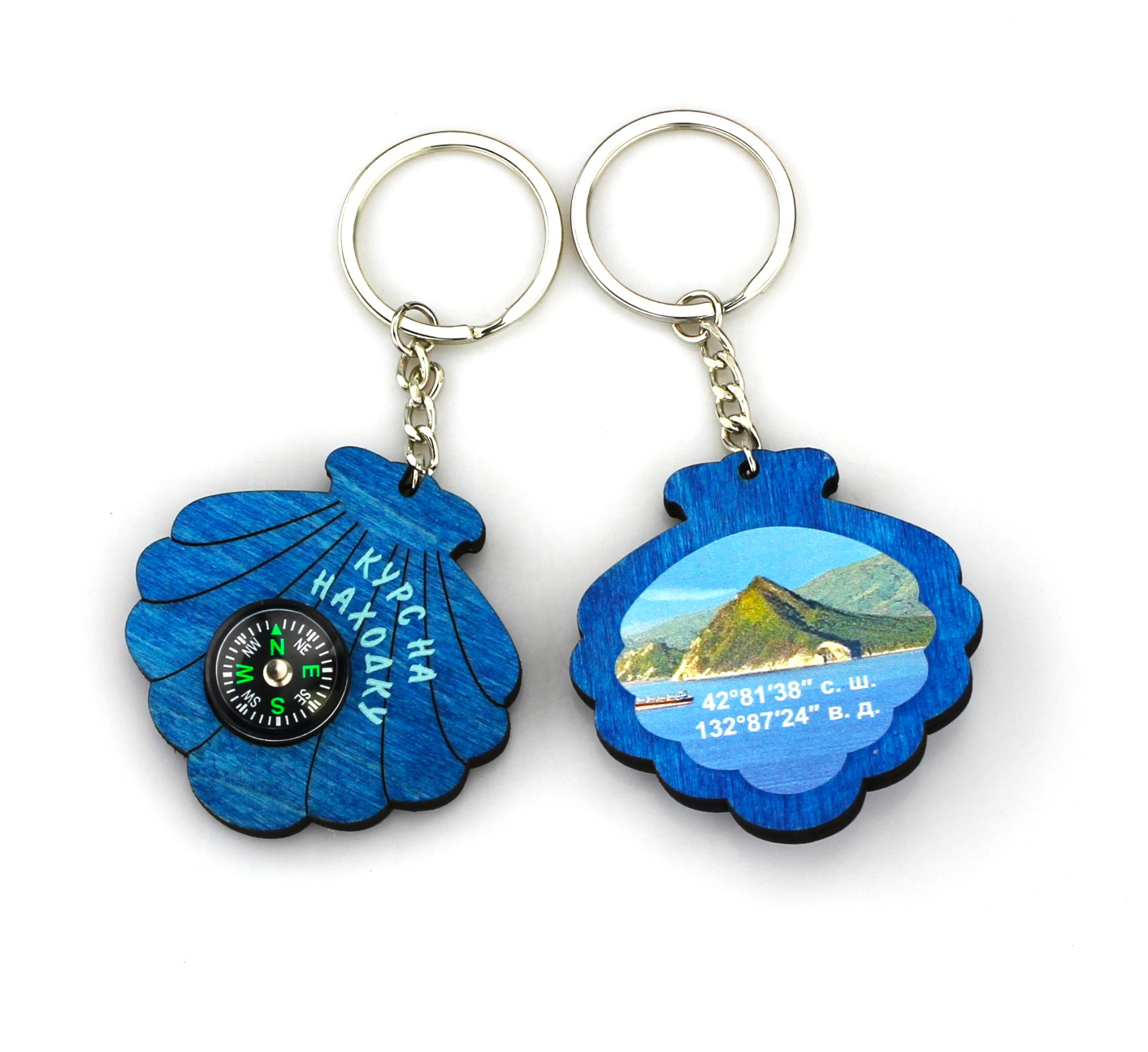 Брелок деревянный с полноцветной печатью, с компасом ГРЕБЕШОК Находка. Кольцо: бронза. Цвет дерева: синий, зеленый и другие. Материал: фанера, пластик, металл. Размер: 10х5х0,8 см. Упаковка: картонный подвес.