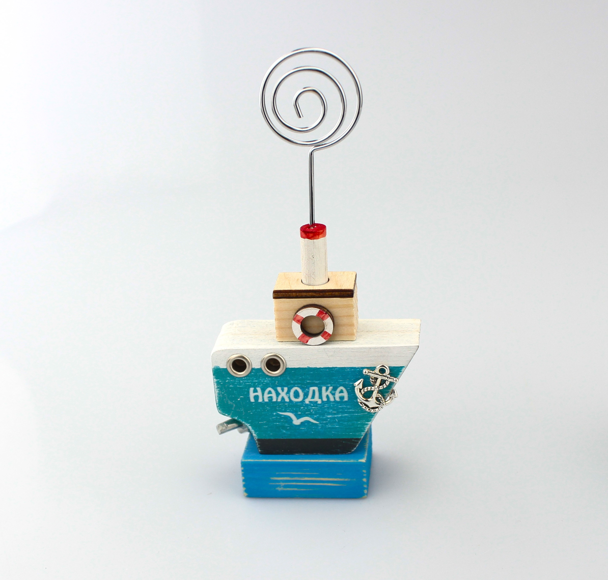 Держатель для визиток, фото, записок КОРАБЛИК НАХОДКА. Настольный сувенир РУЧНОЙ РАБОТЫ. Материал: массив сосны, фанера березовая, металл. Размер