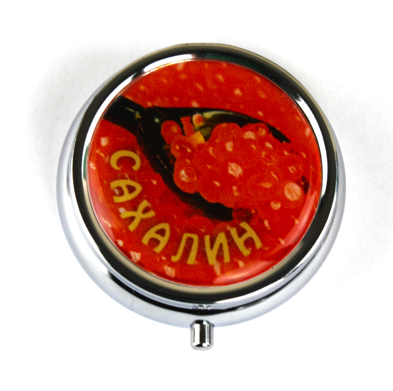 Таблетница с полноцветным изображением на крышке САХАЛИН ИКРА. Материал: металл, пластик, ПВХ, Эпоксидная смола. Размер 50х50х1,7 мм. Упаковка: ПП пакет.
