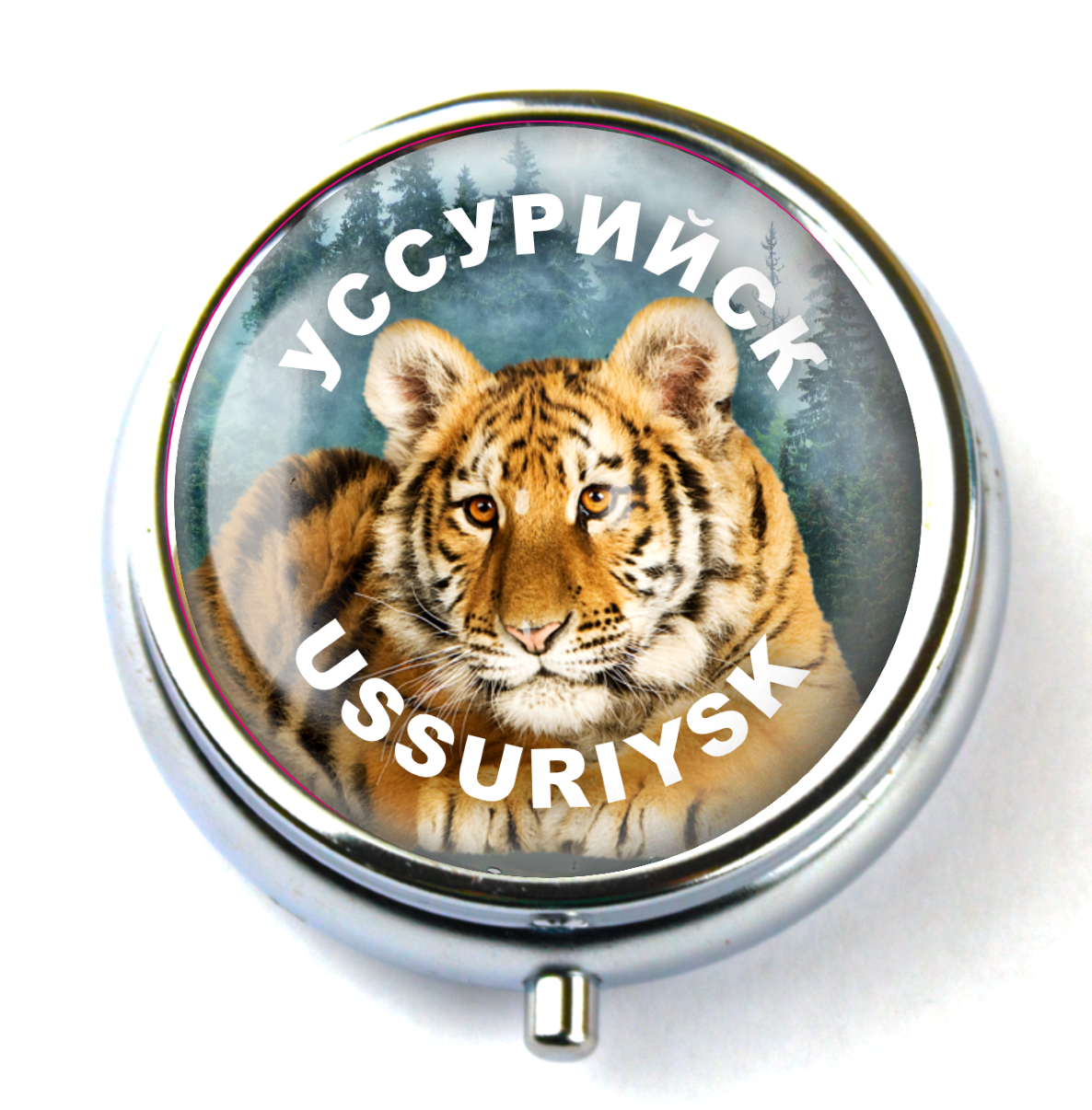 Таблетница с полноцветным изображением на крышке УССУРИЙСК ТИГР на зеленом лесном фоне. Материал: металл, пластик. Размер 50х50х1,7 мм. Упаковка: ПП пакет.