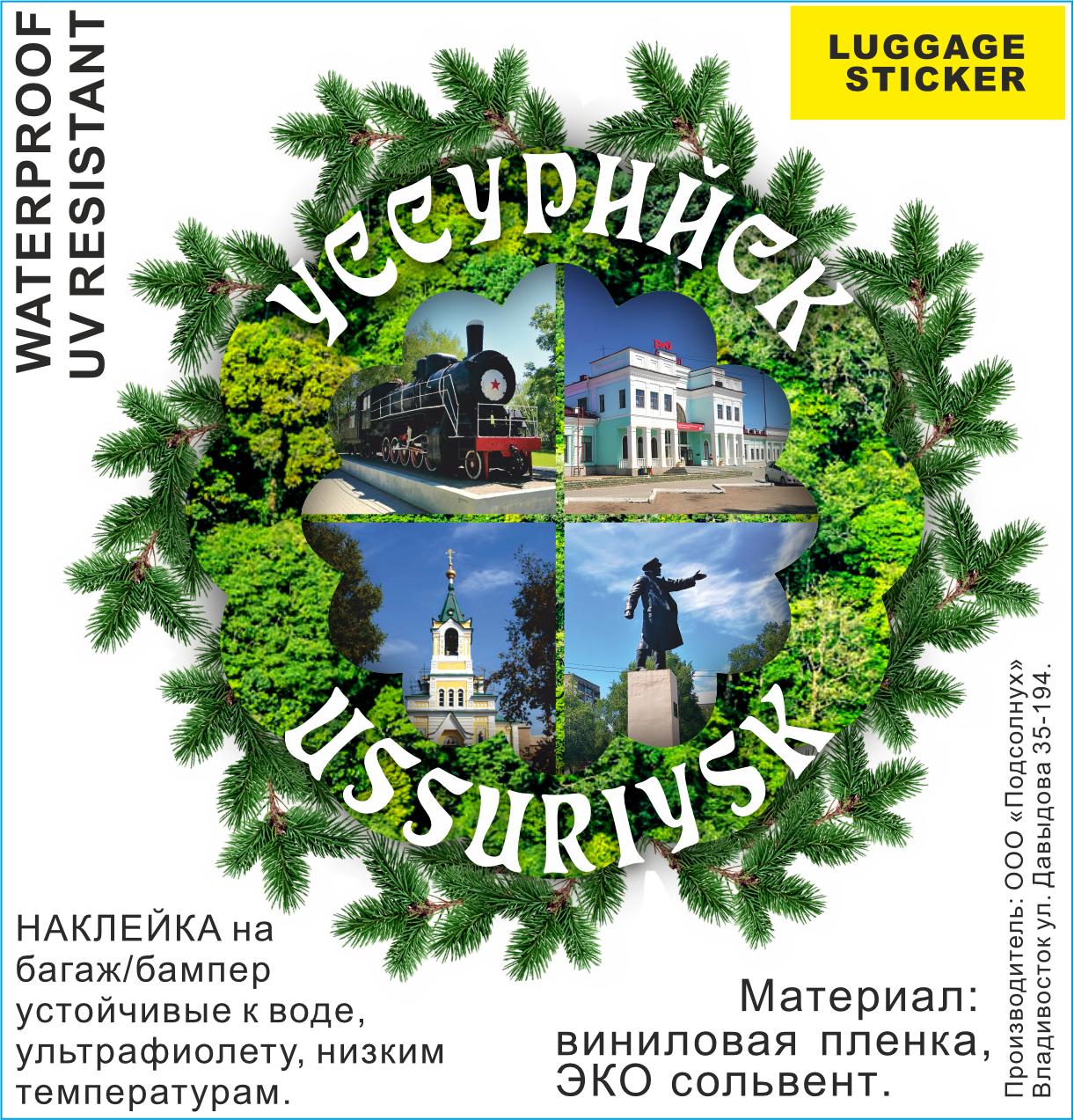 Наклейка багажная УССУРИЙСК ЕЛКИ. Размер 90х90 мм. Материал: виниловая пленка самоклеющася, эко-сольвентная печать. Упаковка: ПП пакет с подвесом.