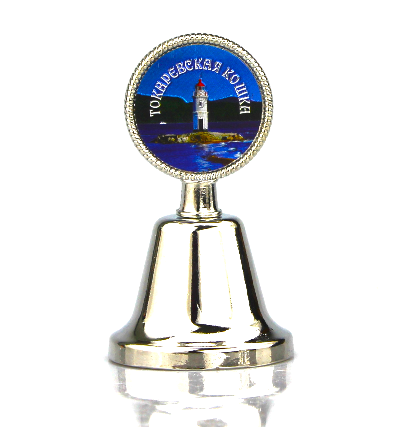 Колокольчик сувенирный с вставкой из тисненной фольги Токаревская кошка. Размер: 4.5х4.5х8 см. Материал: металл. Упаковка: белая картонная коробка.